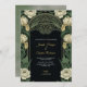 Elegant wedding invitation with a dark background, ornate floral border in green and cream tones. Text in gold cursive conveys a formal, classic tone.
