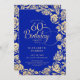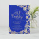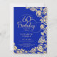 Convite de aniversário real de ouro azul floral 60º. Design elegante com rosas, folha de ouro falsa e letra de script de tipografia. A Trendy convida o cartão perfeito para uma festa de na moda. Pode ser personalizado para qualquer idade. Personalize com seus próprios detalhes. Impressos convites Zazzle ou modelo de impressão digital instantânea para download.