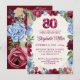 Aniversário do Elegante 80 - Convite para Design Floral Burgundy. Celebre 80 anos maravilhosos com este elegante convite de aniversário floral. Apresentando flores ricas, vermelho-burguês e azul-d-água em um fundo texturizado macio, este design destaca o marco com "80" floral ousado e tipografia clássica. Uma na moda para convidar convidados para uma comemoração memorável de 80.