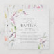 Convite ao Batismo Sagrado, quadrado moderno, elegante, com prigs de flores silvestres a aquarelas em tons de amarelo, rosa, lavanda, azul e verde. Personalize os detalhes em branco suave, acentuado com uma bela caligrafia moderna com letras. A parte de trás da carta apresenta um padrão de flor silvestre correspondente. Copyright Elegant Invites de Anastasia Surridge, todos os direitos reservados.