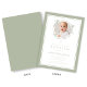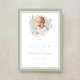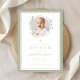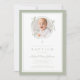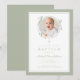 Elegante convite de batismo com arco verde manso. Para melhores resultados, envie uma imagem quadrada do bebê.