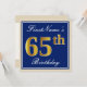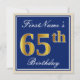 Estas características simples e da bolsa mensageifesta de aniversario elegante do convite de design uma mensagem personalizada como de "aniversário FirstName o 65th" (com "65th" tendo o falso/imitação ouro-como o olhar da coloração) dentro de uma área quadrada azul-colorida que caracteriza um esboço de beira simples. O nome em um elegante branco-é colorido roteiro-como o texto, e pode ser personalizado. A parte traseira caracteriza detalhes customizáveis do convite. Um convite de aniversário como este poderia talvez ser usado ao convidar pessoas a uma festa de aniversário que está sendo guardarada para alguém que está comemorando seu sessenta quintos aniversários. [~Z0000228]