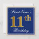 Este design de convite simples e bolsa mensageifesta de aniversario elegante apresenta uma mensagem personalizada como "Aniversário do 11 do Nome" (com o "11" a ter um aspecto de cor falsa/imitação dourada) numa área quadrada de cor azul com um contorno de fronteira simples. O nome está em um texto elegante, de cor branca, semelhante a script, e pode ser personalizado. A parte traseira apresenta detalhes personalizados do convite. Um convite de aniversário como este poderia talvez ser usado ao convidar pessoas para uma festa de aniversário em prisão preventiva para alguém que comemora seu décimo primeiro aniversário. [~Z0000228]