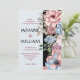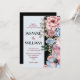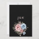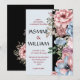 Um buquê chique de flores silvestres cor-de-rosa e azuis com uma natureza empoeirada, rodeado por um fundo preto com escrita elegante à mão. Eu ficaria grato se fizesse parte do seu casamento feliz.