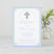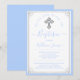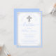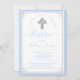 Convites de batismo elegantes em azul bebê e prata com linda cruz prateada em um fundo com borda azul bebê e prata. Este convite de batismo de menino é facilmente personalizado para o seu evento adicionando seus detalhes. Você também pode mudar a cor do azul para a cor que preferir. Você pode remover a pérola azul da cruz se preferir.
