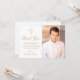 Envie um cartão de agradecimento personalizado simples, mas elegante, com foto, para familiares e amigos por terem comparecido à sua primeira comunhão. Este design apresenta uma foto à direita para facilmente mudar para a sua, e à esquerda, uma simples cruz cristã dourada com a sua mensagem de agradecimento em estilo clássico com letras douradas. Personalize a mensagem de agradecimento com a sua ou use como está. O verso do cartão tem uma cruz dourada correspondente sobre um fundo branco. Este foi um prazer de criar. Espero que goste! Criado por Susan Coffey.