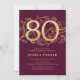 Elegante convite de aniversário de 80 de ouro de marrom. Design de vinho de marsala tinto escuro, personalizável, com acentos botânicos rosas e letra tipografia. Simples cartão de convite floral perfeito para uma comemoração de um na moda. Personalize com seus próprios detalhes. Impressos convites Zazzle ou modelo de impressão digital instantânea para download.