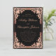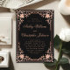 Este elegante convite de casamento preto e rosa com um ar vintage tem uma moldura rosa ornamentada com elegantes decorações barrocas em dourado rosa (falso) nos cantos, sobre um fundo preto. Os nomes da noiva e do noivo são escritos em uma fonte caligráfica elegante. Todo o texto pode ser personalizado e tem uma cor rosa semelhante à moldura.
