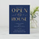 Crie convites elegantes para eventos de negócios para sua festa de aquecimento ou festa de novos negócios com este Convite de Casa Aberta com efeito dourado falso. Este convite de evento de casa aberta azul marinho e dourado apresenta um layout moderno com fontes sofisticadas, espaço para o seu logotipo e detalhes do evento, perfeito para convidar os convidados para a sua Festa de Aquecimento.