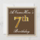 Este design de convite simples e bolsa mensageifesta de aniversario elegante apresenta uma mensagem personalizada, como "ANameHere's 7 Birthday" (com o "7" a ter uma aparência de cor dourada falsa/imitada), dentro de uma área quadrada de cor castanha com um contorno de fronteira simples. O nome está em um texto elegante, de cor branca, parecido com script, e pode ser personalizado. A parte traseira apresenta detalhes de convite personalizáveis. Um convite de aniversário como este poderia talvez ser usado ao convidar pessoas para uma festa de aniversário em prisão preventiva para alguém que comemora seu sétimo aniversário. [~Z0000229]