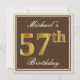 Este design de convite simples e bolsa mensageifesta de aniversario elegante apresenta uma mensagem personalizada como "57º Aniversário de Michael" (com o "57º" a ter uma aparência falsa/imitada de cor dourada) dentro de uma área quadrada de cor castanha com um contorno de fronteira simples. O nome está em um texto elegante, de cor branca, parecido com script, e pode ser personalizado. A parte traseira apresenta detalhes de convite personalizáveis. Um convite de aniversário como este poderia talvez ser usado ao convidar pessoas para uma festa de aniversário que está sendo realizada para alguém que está comemorando seus cinquenta e sete anos. [~Z0000229]