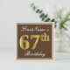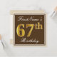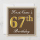 Este design de convite simples e bolsa mensageifesta de aniversario elegante apresenta uma mensagem personalizada, como "67º Aniversário do Primeiro Nome" (com o "67º" a ter um aspecto de cor falsa/imitação em forma de ouro), dentro de uma área quadrada de cor castanha com um contorno de fronteira simples. O nome está em um texto elegante, de cor branca, parecido com script, e pode ser personalizado. A parte traseira apresenta detalhes personalizados do convite. Um convite de aniversário como este poderia talvez ser usado ao convidar pessoas para uma festa de aniversário em prisão preventiva para alguém que comemora seu sessenta e sétimo aniversário. [~Z0000229]
