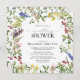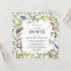 Chá de casamento quadrado moderno, elegante, com flores silvestres de verão, cor d'água, como ervilhas doces, tremoços, snapdragões, e mais, em tons brilhantes de verão de rosa, lilás, lavanda, amarelos, azuis e delicadas folhas botânicas verdes. Personalize os detalhes do seu chá de panela em preto, acentuado com uma bela caligrafia à mão moderna. Copyright Elegant Invites, todos os direitos reservados.