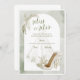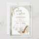 Um chá de panela elegante com um fundo aquoso verde de sábio macio, um delicado vestido branco de noiva, saltos altos de chic com arcos de fita e sotaques verdes botânicos. Perfeito para celebrações sofisticadas e românticas, esta design combina encanto clássico com a moderna arte de aquarela, ideal para noivas que amam elegância eterno.