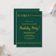Este elegante convite de Aniversário verde e dourado é perfeito para um Aniversário moderno. o simples design apresenta uma elegante caligrafia de ouro num fundo verde.