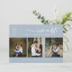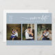 Este convite para salvar a data apresenta um elegante estilo moderado e minimalista de uma colagem de três (tri) fotos com uma caligrafia moderna do texto "Salvar a Data" e fontes elegantes da Serif para um olhar minimalista e moderno limpo sobre um fundo azul empoeirado, que é uma bela maneira de informar sobre o seu próximo casamento. Anuncie à sua família e amigos que vai se casar com este convite e adicione um toque pessoal com belas fotos de você e sua próxima metade melhor. A simplicidade desta design adiciona um toque de elegância ao seu casamento. Funciona bem com muitos temas de casamento e definitivamente um excelente extra para o seu casamento. Basta personalizar os nomes e o texto em alguns passos fáceis e personalizar o cartão de convite com sua foto do casal feliz e substituir o Código QR pelo seu. Observe que o texto "Salvar a data" juntamente com outros trabalho de arte gráficos e elementos não podem ser editados, alterados ou excluídos. Se precisar alterar a cor, você pode personalizar o cartão de convite. Você pode personalizar e personalizar o convite para ajustado das suas necessidades de evento de casamento e clicar em personalizar o convite. Você pode personalizar facilmente o convite com o texto como um download digital e enviá-lo eletronicamente e compartilhá-lo com seus convidados através de mensagem de texto, email ou mídia social. Ou também pode optar por enviar/postar o convite relativo aos seus detalhes aos seus convidados. Ou você pode receber ambos — convite impresso e receber o convite em formato digital como um download instantâneo.