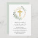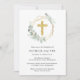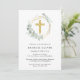 Um convite elegante para o batismo, com a ilustração aquosa de uma simples cruz de ouro, um traçado geométrico de ouro, enfeitado com um eucalipto verde-sábio verde.