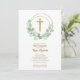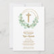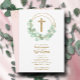 Os primeiros convites de comunhão elegantes apresentam uma cruz falsa dourada, uma coroa de folhas de eucalipto e seus detalhes em caracteres quicos na frente e pontos dourados em rosa no verso. Perfeito para a primeira comunhão do seu filho, batismo ou batizar. Itens CORRESPONDENTES disponíveis em nossa loja.