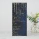 Estes menus elegantes são perfeitos para qualquer casamento elegante à noite. Um belo fundo azul escuro com luzes luminosas e vagalumes brilhando nas folhas das árvores e no fundo. Procure os itens correspondentes vendidos aqui: https://www.zazzle.com/store/heritagematters/products?cg=196873255086485540