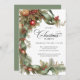 Um belo e elegante Convite de festas de Natal, com estilos luxuosos e talho tradicional, este design apresenta um buquê de cor d'água evergreens, cones de pínus, bagos vermelhos e elementos florais com uma fita verde enrolando através do arranjo que lembra o decor vitoriano na era dourada. O convite prepara seus convidados para uma noite de festas de férias e boa alegria. Personalize o modelo de texto fácil de usar com os detalhes da sua parte. Este convite está disponível no formato digital de download impresso e instantâneo para sua conveniência.