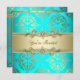 Modelo de convite de festa em damaque azul-turquesa e dourado. Adicione seus detalhes na frente e no verso deste convite de festa e evento elegante azul-turquesa e dourado simplesmente escolhendo o botão "Personalize!" para começar a adicionar os detalhes do seu evento, estilo de letra, tamanho e cor da letra e texto. Por favor, note que - todos os desenhos de convite que você encontrará no Zazzle são gráficos impressos em papel liso sem joias, laços, relevos, rebaixos ou peças ou partes adicionadas.