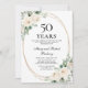 Modelo de convite de aniversário de casamento de 50 anos elegante apresenta uma moldura dourada e dois arranjos de rosas brancas. Todo o texto é editável.