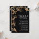 Convite de aniversário surpresa elegante, com um fundo preto clássico com decoração de elemento tropical dourado falso e um modelo de aniversário em fonte serifada branca que é fácil de personalizar. Adequado para qualquer idade.