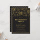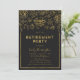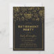 Convite de festa de aposentadoria com estampa floral elegante com detalhes em folha de ouro falso e borda em um fundo cinza escuro na frente. O convite tem um padrão de bolinhas douradas falsas contra um fundo cinza escuro no verso.
