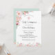 Linda moça floral de aquarela Primeiro convite da Comunidade com um arranjo floral refinado no canto superior esquerdo e campo de flores no fundo do cartão, com flores em delicados tons cor-de-rosa pincelados com detalhes de brilho rosa e verde-menta. O cartão está de volta em tom verde de menta com detalhes florais no fundo. Convite com seção para detalhes de "Cerimônia" e "Recepção". Parte do nosso casamento e da coleção de eventos.