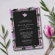 Sombras elegantes de púrpura, lavanda e branco, esses convites florais de casamento mostram flores de magnólia de cor d'água e seus detalhes de casamento em letras brancas chicas contra um fundo preto. ITENS CORRESPONDENTES na nossa coleção.