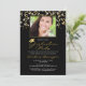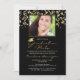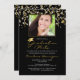 Convite elegante de festa de formatura preto, dourado e branco, com foto de seu formando, confetti, otimizadores e luzes, um design de título de tipografia manuscrita de tendência, acentuado com um boné de formatura ou placa de mortalha em ouro contra um fundo preto editável que você pode mudar para uma cor da escola, uma cor para coordenar com sua foto ou uma cor favorita. A parte traseira apresenta CLASSE DE ANO. ASSISTÊNCIA: para obter ajuda com a modificação ou personalização do design, alteração de cor, transferência do design para outro produto ou você gostaria de coordenar itens, entre em contato com o designer ANTES DE ENCOMENDAR através da guia MENSAGEM de bate-papo Zazzle ou envie um email para makeitaboutyoustore@gmail.com.