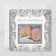 Convite de batizado de fotografia gêmea branco com redemoinhos prateados elegantes. Este lindo convite de batizado branco é facilmente personalizado para o seu evento, basta adicionar sua foto e detalhes do evento, estilo de fonte, tamanho e cor da fonte e texto.