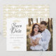 Este elegante cartão de salvar a data apresenta a sua foto e belas pombas douradas e corações acima de um salvar a data em escrita e seus nomes, data e local. O verso apresenta um padrão de pombas e corações. Concebido por Thisisnotme©
