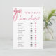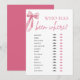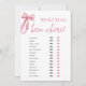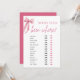 Embarque numa viagem de experiências compartilhadas com o nosso jogo "Pink Bow She's Tying the Knot Bridal Shower - Quem Foi Onde". Os convidados compartilharão histórias de suas aventuras e viagens, tentando adivinhar quem visitou vários destinos, provocando risadas e conversas animadas. Com seu charmoso design de laço rosa, este jogo adiciona um toque caprichoso à sua celebração, criando momentos memoráveis para a noiva e seus convidados. Deixe que as histórias se desenrolem à medida que todos se conectam através de seu desejo de viajar e aventuras!