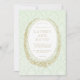 Este convite de casamento verde é perfeito para uma noiva moderna que aprecia um estilo francês antigo. O design apresenta um antigo trecho de louros em volta dos detalhes do casamento. O design está sobre um fundo verde-claro de damasco.