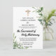 Introduza um sentido de elegante serenidade na sua celebração de casamento com o nosso Convite de Missa Nupcial Floral Verde Suave Elegante Branco. Este design apresenta um fundo branco limpo que realça a beleza sutil de flores brancas e verdes suaves que enquadram delicadamente a borda. No topo do convite, repousa uma cruz marrom de design sofisticado, rodeada por uma guirlanda de flores, simbolizando a base espiritual da sua união. Esta mistura harmoniosa de flores e do motivo da cruz captura perfeitamente tanto a santidade quanto a alegria da ocasião.