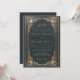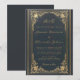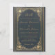 Este convite de casamento elegante com um ar vintage, recomendado para um casamento mais formal, "black tie", tem uma moldura dourada vintage com elegantes decorações barrocas douradas em um fundo de couro azul escuro. O monograma acima, os nomes da noiva e do noivo e a última frase são escritos em uma elegante fonte caligráfica. O devido crédito é dado aos pais da noiva e do noivo na frase "juntamente com suas famílias" precedendo seus nomes. Todo o texto pode ser personalizado e tem uma cor dourada semelhante à moldura dourada vintage.