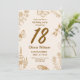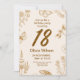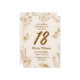 Um elegante design de carta de convite comemorando um aniversário de 18 anos. O fundo apresenta um tom bege quente com delicados elementos decorativos, incluindo flores, borboletas e plantas ilustradas em linhas de ouro finas