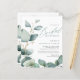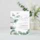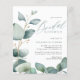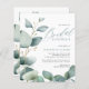 Convite elegante e moderno para chá de noiva boho chic com folhas de eucalipto e suculentas em verde oliva, azul poeirento e dourado dentro do orçamento.