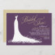 O convite de chá de chá de noiva elegante para a futura noiva de na moda apresenta uma letra de roteiro de caligrafia de ornamentado e um vestido de noiva fluente. O escroto floresce, flores e borboletas detalham o vestido etéreo. Branco, ameixa / berinjela púrpura e ouro de champanhe / cores de outono cor castanho.