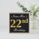 Este design de convite simples e bolsa mensageifesta de aniversario elegante apresenta uma mensagem personalizada, como "Name-Here's 22nd Birthday" (com o "22º" a ter um visual falsa/imitado de cor dourada) dentro de uma área quadrada de cor preta com um contorno de fronteira simples. O nome está em um texto elegante, de cor branca, semelhante a script, e pode ser personalizado. A parte traseira apresenta detalhes personalizados do convite. Um convite de aniversário como este poderia talvez ser usado ao convidar pessoas para uma festa de aniversário que está sendo realizada para alguém que comemora seu vigésimo segundo aniversário. [~Z0000224]