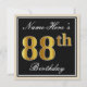 Este design de convite simples e bolsa mensageifesta de aniversario elegante apresenta uma mensagem personalizada como "88.º Aniversário do Nome-Aqui" (com o "88.º" a ter uma aparência falsa/imitada de cor dourada) numa área quadrada de cor preta com um contorno de fronteira simples. O nome está em um texto elegante, de cor branca, parecido com script, e pode ser personalizado. A parte traseira apresenta detalhes personalizados do convite. Um convite de aniversário como este poderia talvez ser usado ao convidar pessoas para uma festa de aniversário em prisão preventiva para alguém que comemora seu oitavo aniversário. [~Z0000224]