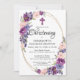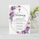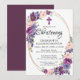 Uma floral roxa de ameixa empoeirada tem belos sotaques rosas cor-de-rosa. Muitas culturas verdes, folhas e vinhas mantêm-no aberto e arejado. Christening está escrito em um roteiro fluente. O nome da menina está escrito em letras clássicas de serifa. O fundo do convite é um roxo profundo. Este modelo batizante bonito é muito fácil de personalizar.