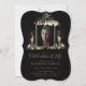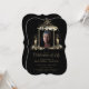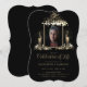 convite de celebração da vida com foto emoldurada com velas douradas e foto no meio com tipografia elegante contra fundo preto.