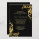 Aqui está um convite de celebração de bodas de ouro magnífico em preto dramático e dourado. Os cantos superior esquerdo e inferior direito são cada um adornados com uma decoração de arabesco dourado "enferrujado" brilhante. Seu texto personalizado está no meio em dourado mais claro para facilitar a leitura. O verso do convite é preto sólido. Muito formal e muito elegante! Este convite é versátil o suficiente para ser usado em qualquer ocasião formal.
