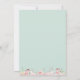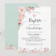 Linda moça floral de aquarelas Convite de batismo com delicado arranjo floral no canto superior esquerdo e campo de flores no fundo do cartão, com flores em delicados tons cor-de-rosa pincelados com detalhes de ouro rosa e verde-menta. O cartão está de volta em tom verde de menta com detalhes florais no fundo. Convite com seção para detalhes de "Cerimônia" e "Recepção". Parte do nosso casamento e da coleção de eventos.
