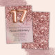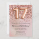 Elegante rosa gold 17th convite de aniversário para uma menina de 17 anos com roteiro elegante escrevendo com fonte preta e balões de folha divertida.