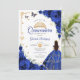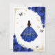 Convite para comemoração da Quinceanera Real Azul, Ouro e Branco. Possui uma morena em vestidos de capa de bola, fonte de script, borboletas douradas, rosas azuis de marinho e tiara. Perfeito para uma elegante celebração de glam estilo princesa. Personalize com seus próprios detalhes. Impressos convites Zazzle ou modelo de impressão digital instantânea para download.
