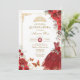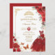 O convite perfeito para a quinceañera da sua filha está finalmente aqui! Este convite cômico e adorável da quinceañera apresenta elegantes rosas vermelhas de aquarela, um vestido de princesa bonito, uma tiara com brilho dourado e duas borboletas fluidificantes. Clique no botão "personalizar mais" se quiser reorganizar e formatar o estilo e a posição do texto.