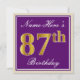 Este design de convite simples e bolsa mensageifesta de aniversario elegante apresenta uma mensagem personalizada, como "Name-Here's 87th Birthday" (com o "87º" a ter uma aparência falsa/imitada de cor dourada), dentro de uma área quadrada de cor roxa com um contorno de fronteira simples. O nome está em um texto elegante, de cor branca, semelhante a script, e pode ser personalizado. A parte traseira apresenta detalhes de convite personalizáveis. Um convite de aniversário como este poderia talvez ser usado ao convidar pessoas para uma festa de aniversário em prisão preventiva para alguém que comemora seu oitenta e sétimo aniversário. [~Z0000226]